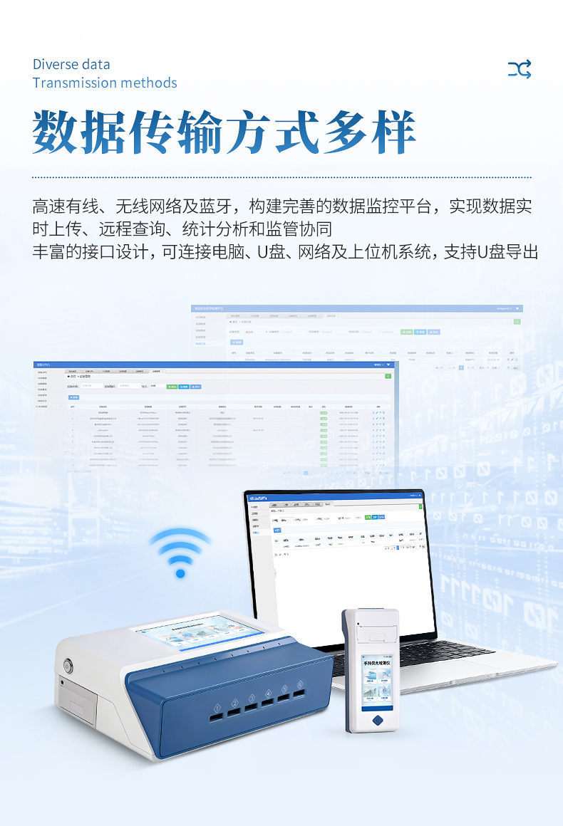 8、 无线网络及蓝牙,构建完善的数据监控平台,实现数据实时上传、远程查询、统计分析和监管协同。
