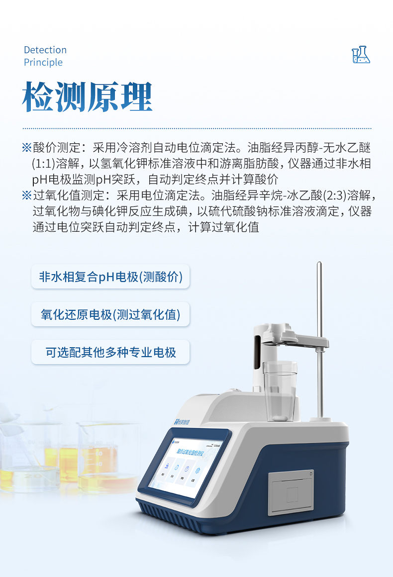 过氧化值测定:采用电位滴定法。油脂经异辛烷-冰乙酸(2:3)溶解,过氧化物与碘化钾反应生成碘,以硫代硫酸钠标准溶液滴定,仪器通过电位突跃自动判定终点,计算过氧化值。