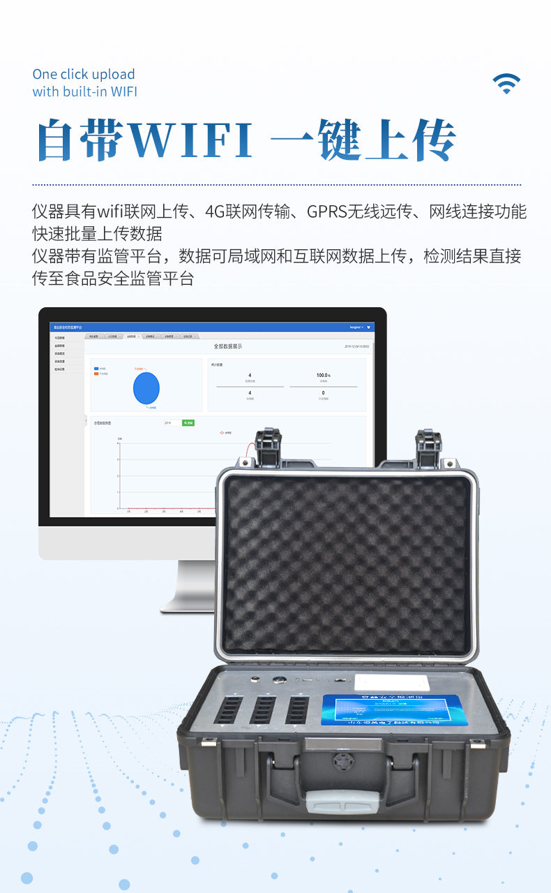4、仪器带有监管平台,数据可局域网和互联网数据上传,检测结果直接传至食品安全监管平台。进行区域食品安全监管及大数据分析处理与数据统计,检测区域食品安全长短期动态,达到食品安全问题预估、预警