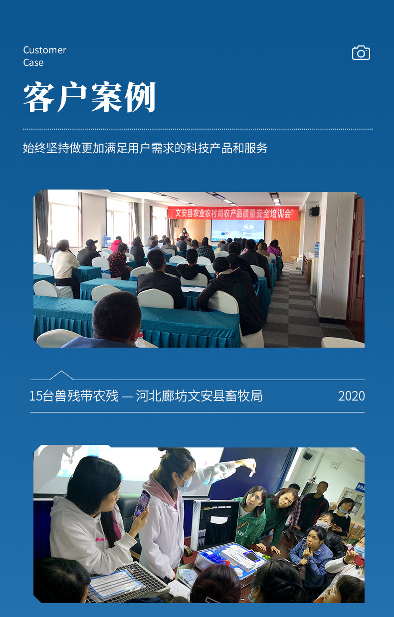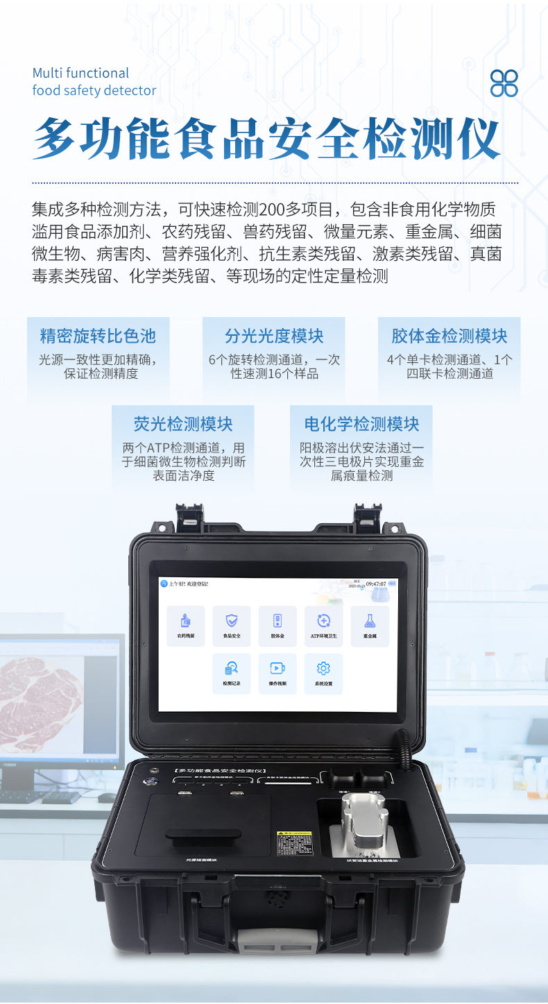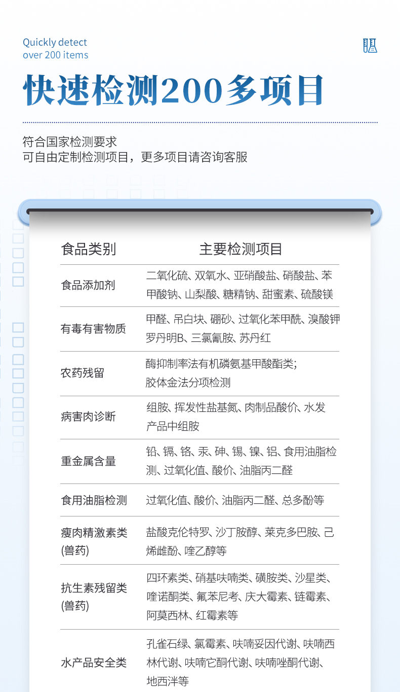 食品安全检测设备可快速检测200多项目,包含非食用化学物质、滥用食品添加剂、农药残留、兽药残留、重金属、病害肉、营养强化剂、抗生素类残留、激素类残留、真菌毒素类残留、化学类残留等现场的定性定量检测。