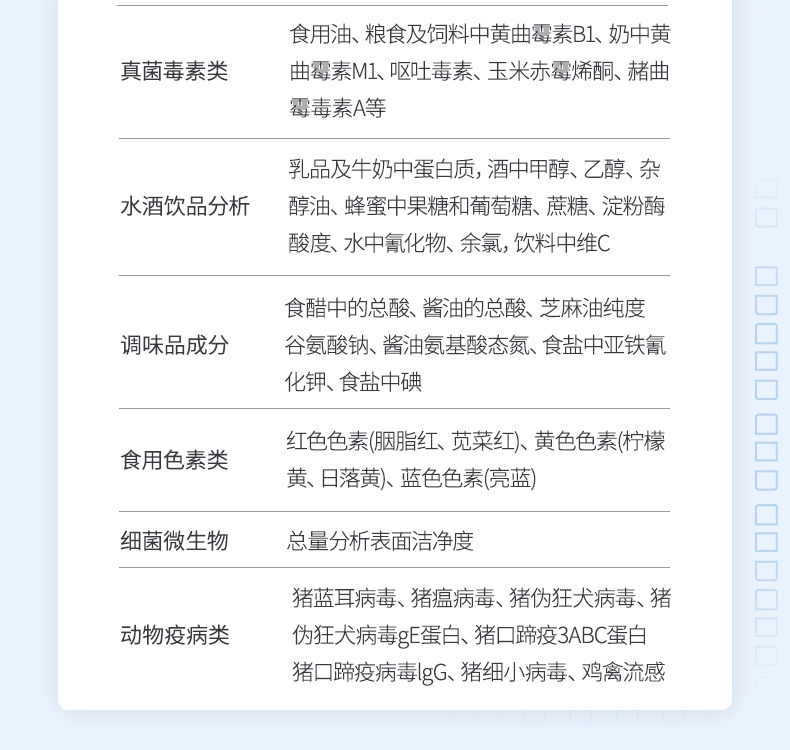 动物疫病类:猪蓝耳病毒、猪瘟病毒、猪伪狂犬病毒、猪伪狂犬病毒gE蛋白、猪口蹄疫3ABC蛋白、猪口蹄疫病毒IgG、猪细小病毒、鸡禽流感等