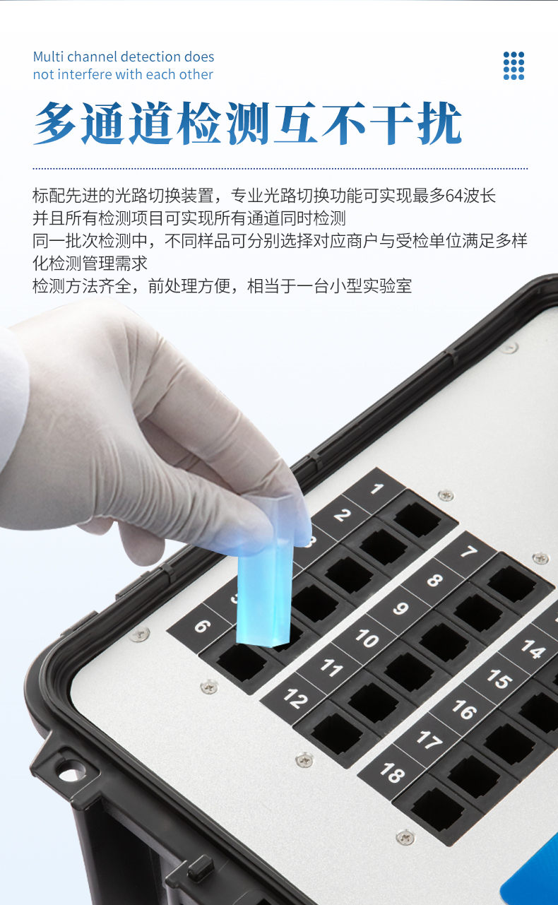 4、四波长冷光源,18个检测通道,每个通道均配置410、520、590、630nm波长光源,标配先进的光路切换装置,专业光路切换功能可实现*多64波长,并且所有检测项目可实现所有通道同时检测。