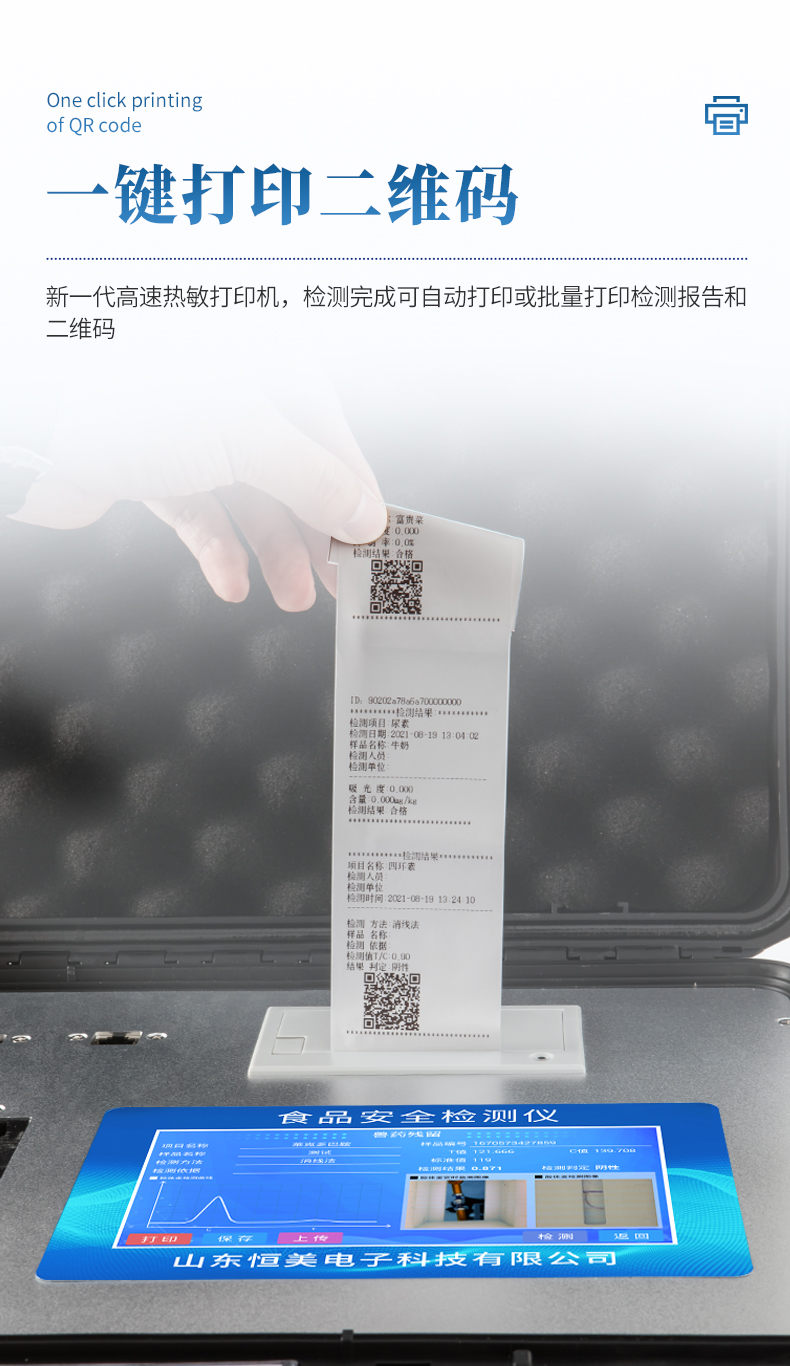 3、新一代高速热敏打印机,检测完成可自动打印或批量打印检测报告和二维码。