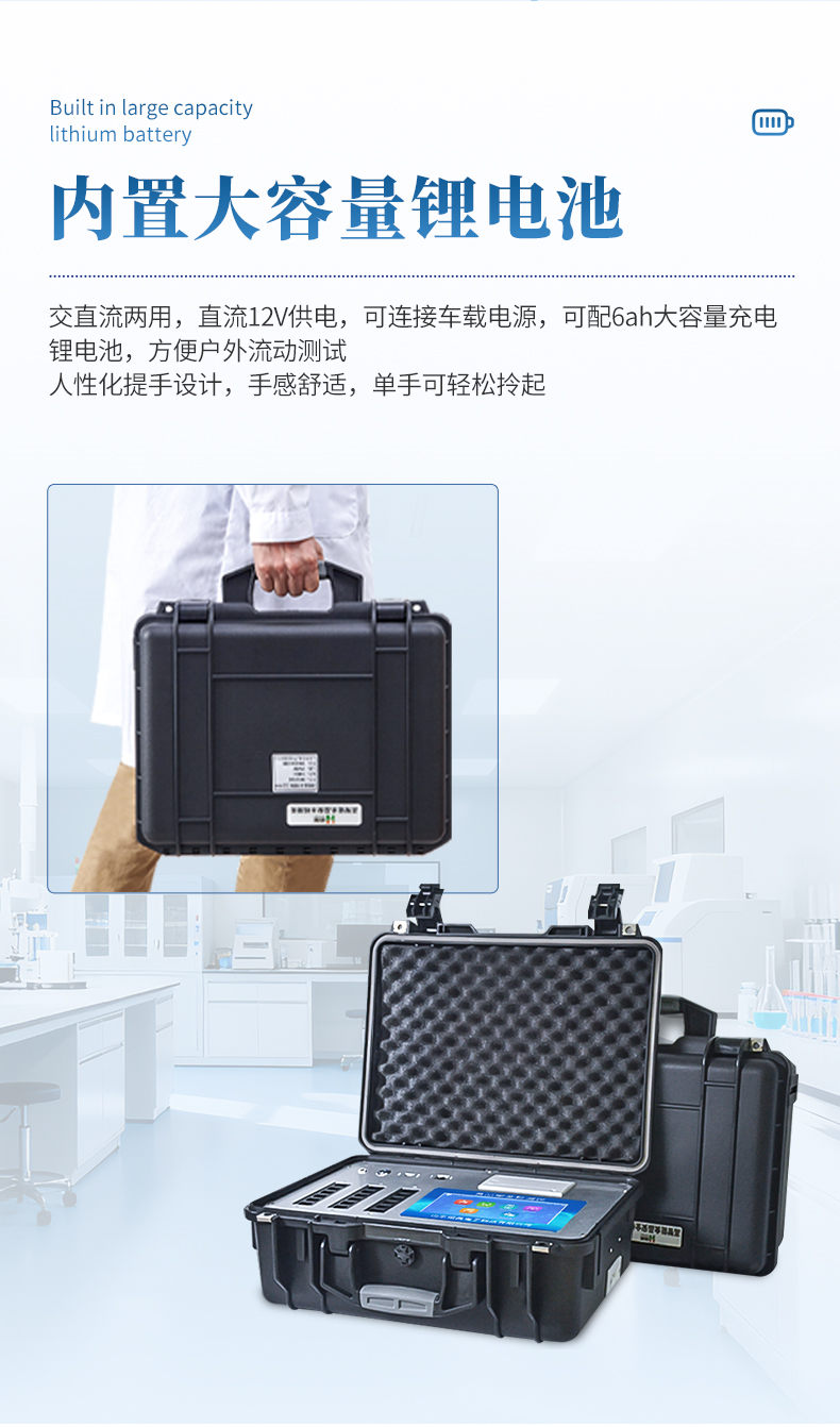 3、交直流两用,直流12V供电,可连接车载电源,可配6ah大容量充电锂电池,方便户外流动测试。
