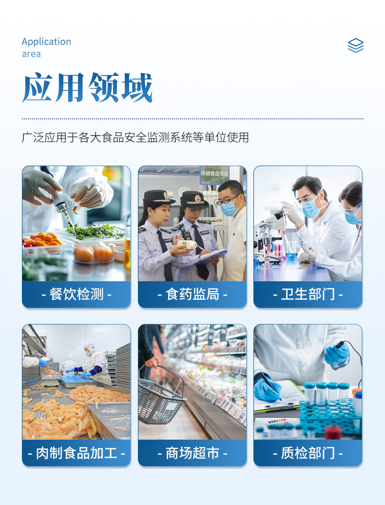 广泛应用于餐饮检测、食药监局、卫生部门、肉制食品深加工企业、商场超市、质量监督检验、工商管理各大食品安全监测系统等单位使用。