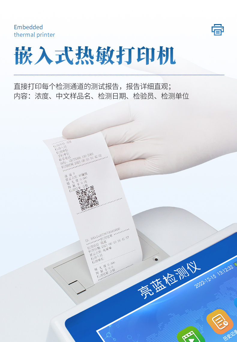 ●带有嵌入式微型热敏打印机,直接打印每个检测通道的测试报告,报告详细直观,内容:浓度、中文样品名、检测日期、检验员、检测单位