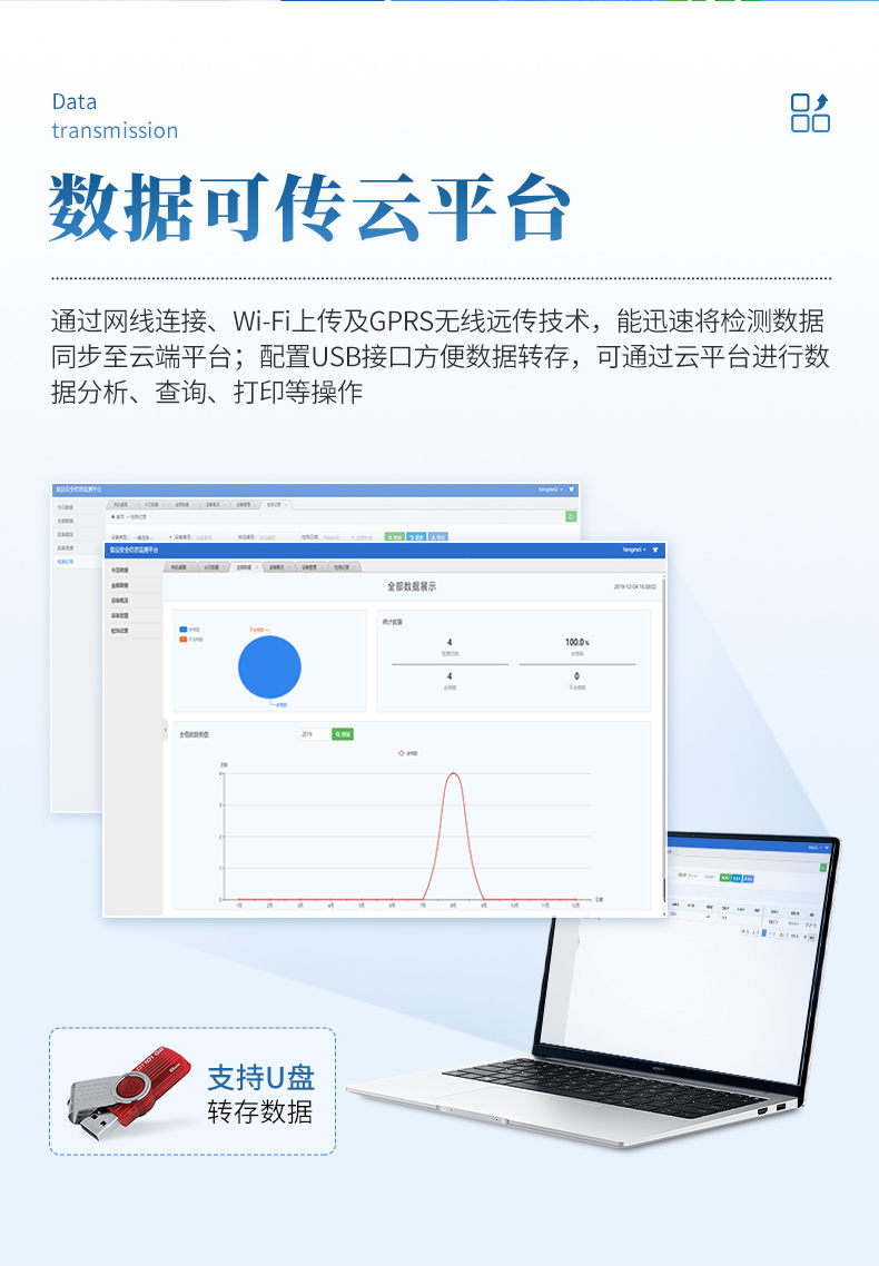 ●配置USB接口,支持U盘转存,方便数据转存至云平台,通过平台实现数据查询、浏览、分析、统计、打印等。