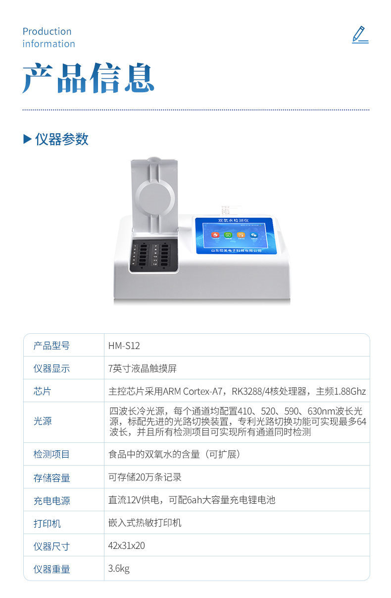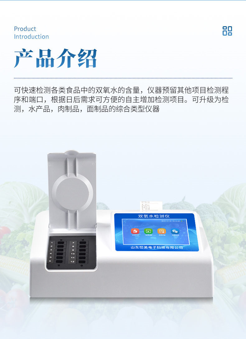 1、 检测项目:可快速检测各类食品中的双氧水的含量,仪器预留其他项目检测程序和端口,根据日后需求可方便的自主增加检测项目。日后可升级为检测,水产品,肉制品,面制品的综合类型仪器。